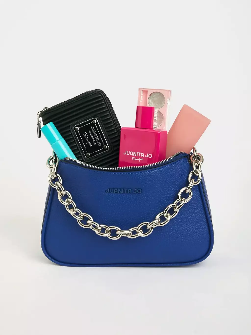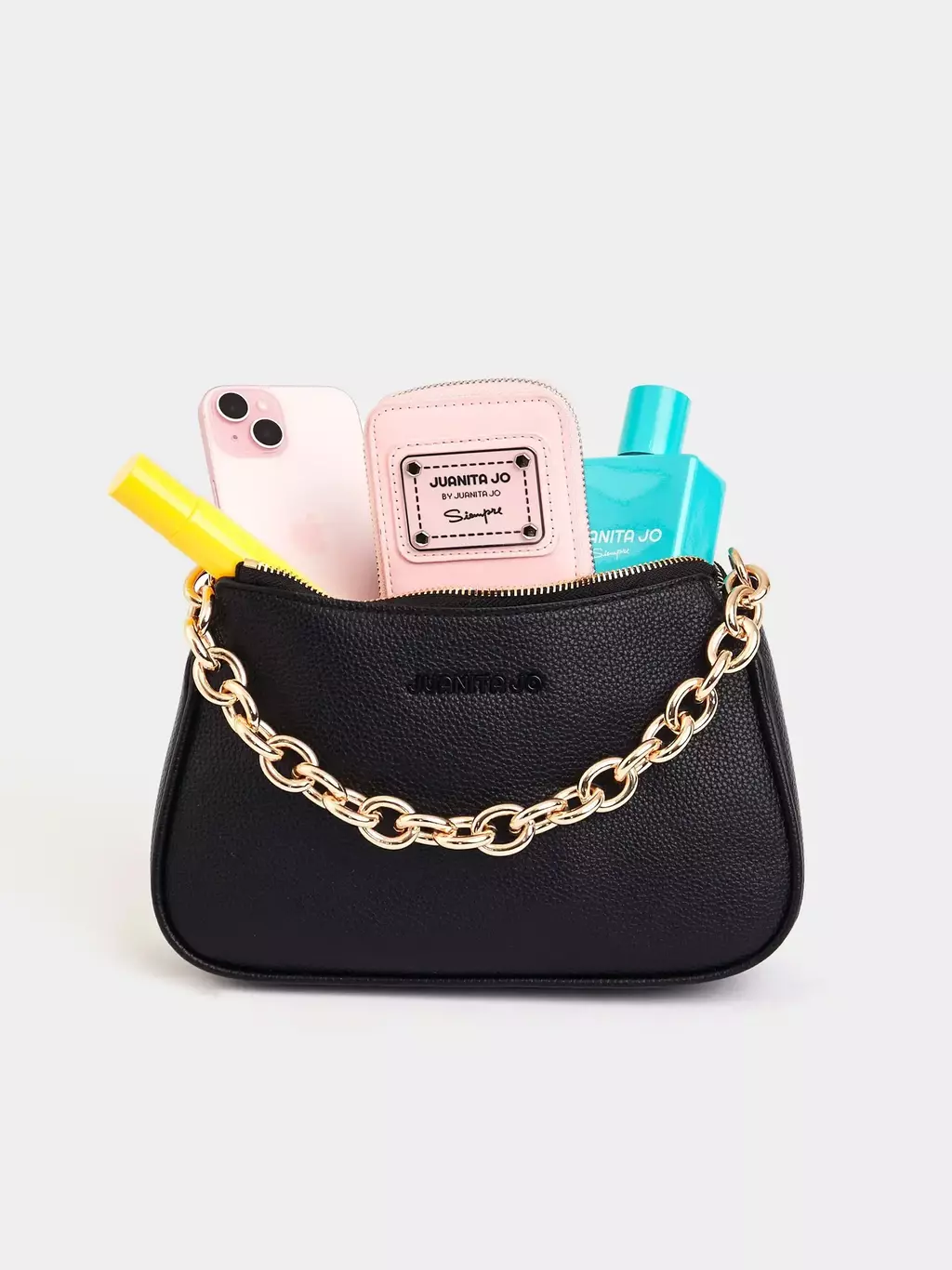 Su cadena metálica resalta sobre eun color profundo y podés usarla como accesorio glam o como correa corta. Además, cuenta con un asa larga regulable y desmontable para llevarla cruzada o al hombro. En su interior, tiene bolsillo práctico. Es perfecta para darle vida a tus salidas nocturnas o para acompañarte en un paseo.