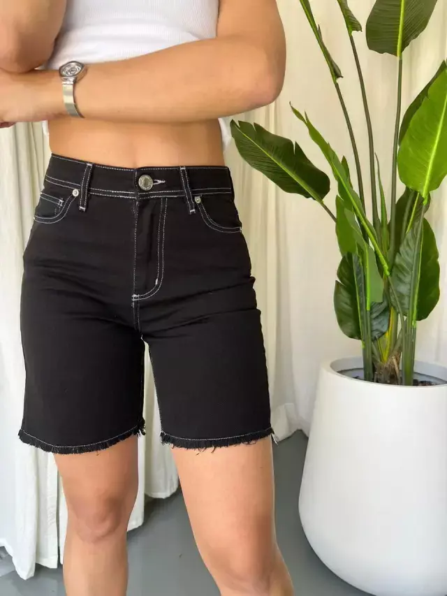 Descubrí la Bermuda Arheta, confeccionada en gabardina negra con delicadas costuras blancas que realzan su diseño. Su tiro alto ofrece una silueta elegante y cómoda, mientras que la terminación al corte y deflecada añade un toque moderno y fresco. Disponible en talles 34, 36, 38 y 40, es una prenda versátil que combina fácilmente con cualquier look. Ideal para quienes buscan estilo y comodidad en una sola pieza.