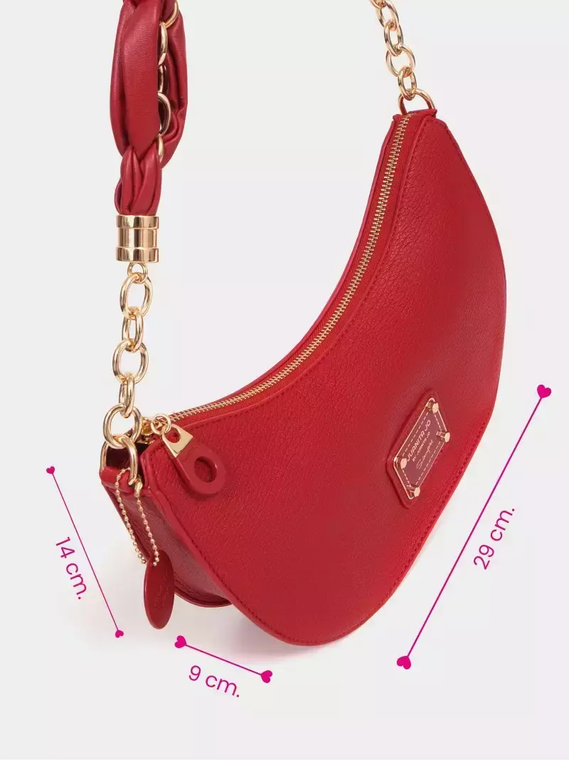 Atrevida, vibrante y lista para destacar. Esta cartera de hombro roja levanta cualquier outfit con su diseño sofisticado y ese toque glam de la cadena metálica combinada con material alternativo al cuero.