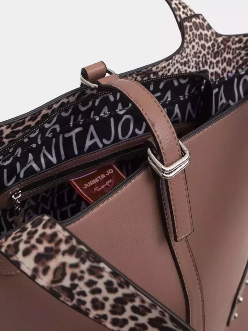 Está confeccionada en material alternativo al cuero y cuenta con varios bolsillos internos, uno de ellos con cierre y un portallaves. Por supuesto que no podía faltar la chapa de Juanita Jo.