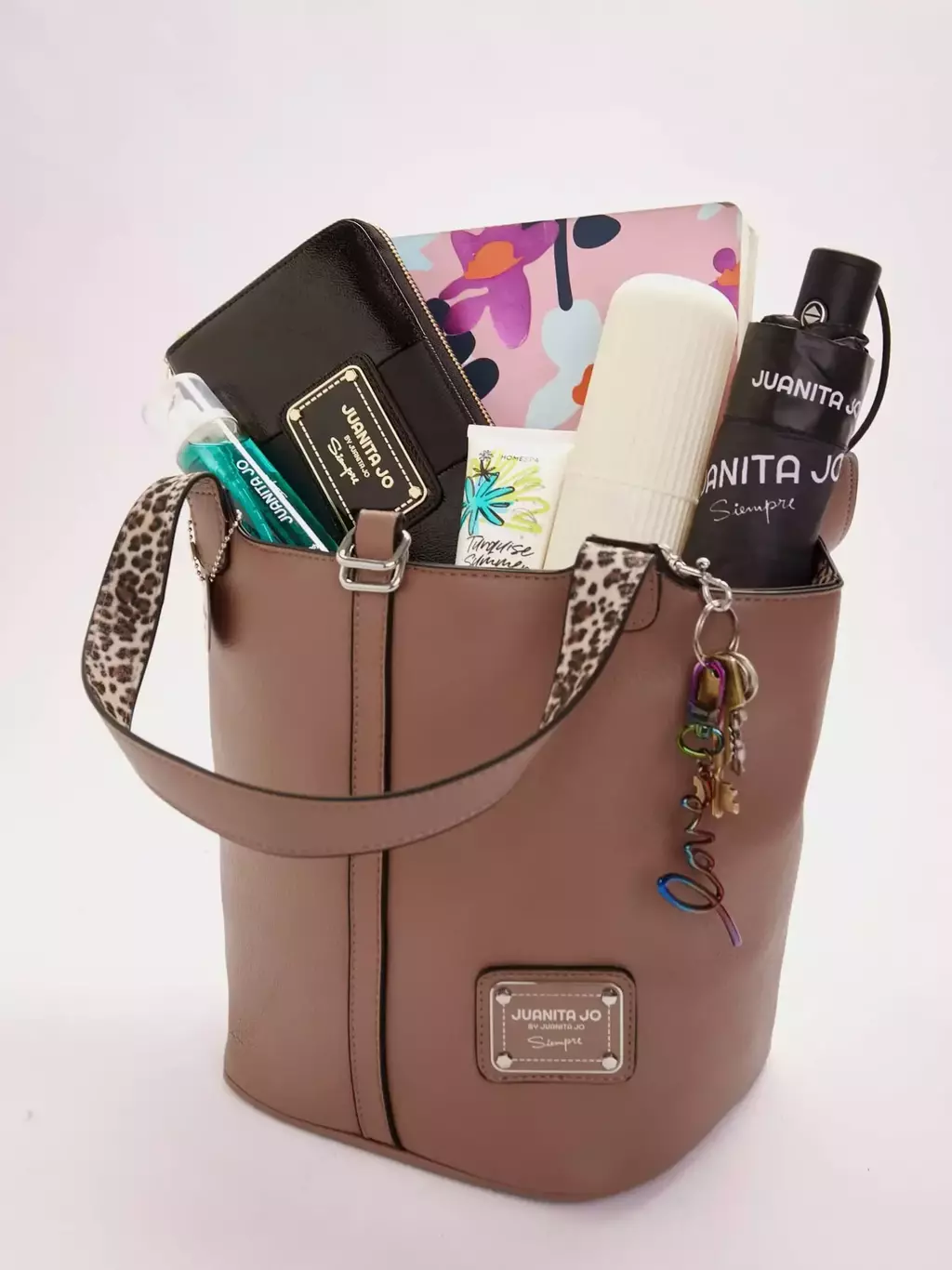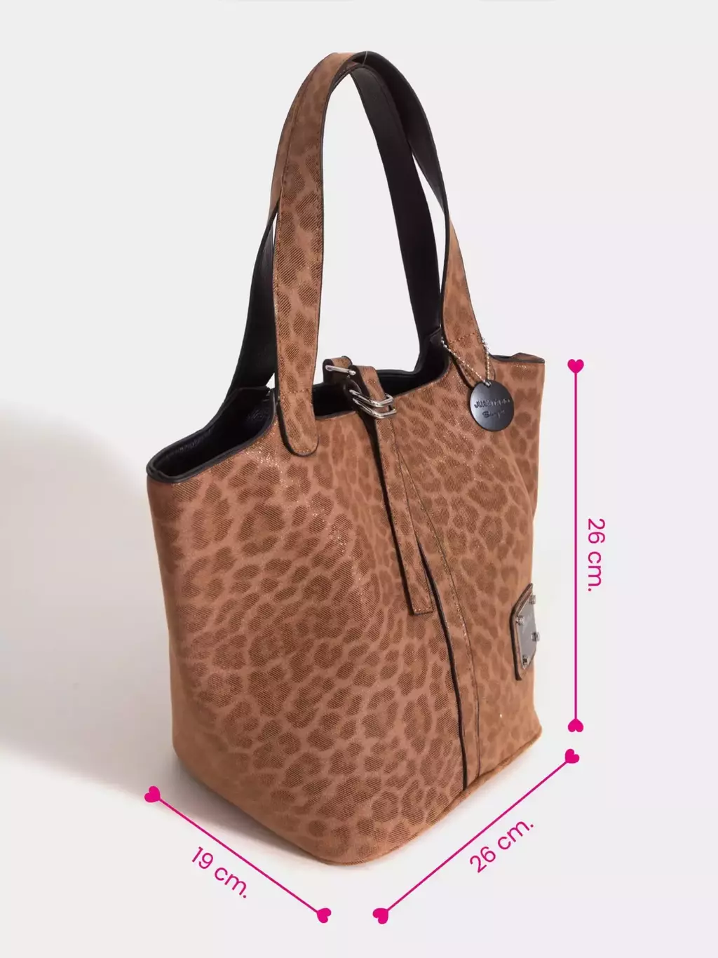 Está confeccionada en material alternativo al cuero y tiene bolsillos internos, uno de ellos con cierre. Tiene la clásica chapa metálica de Juanita Jo y viene con portallaves.